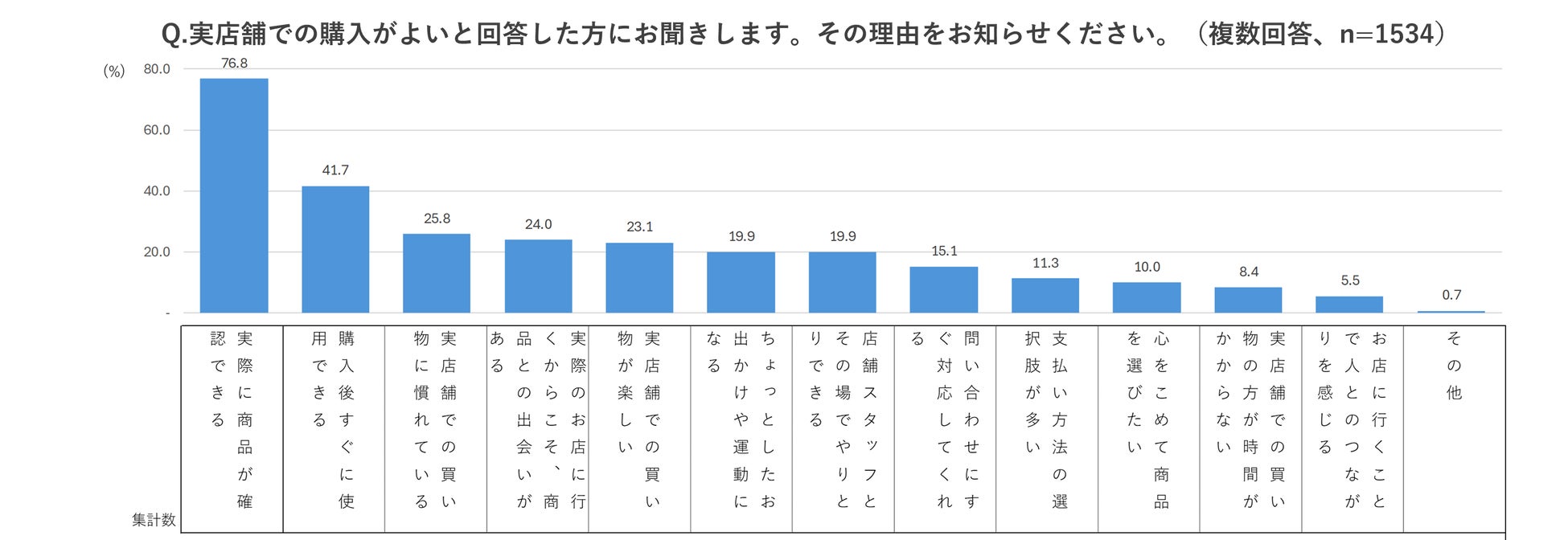 「実際に商品が確認できる」が76.8%と最も多く、「購入後すぐに使用できる」が41.7%で続いています。実物を手に取ることができない、配送の時間が必要というインターネットショッピングの特徴とは逆の面が評価された結果となりました。