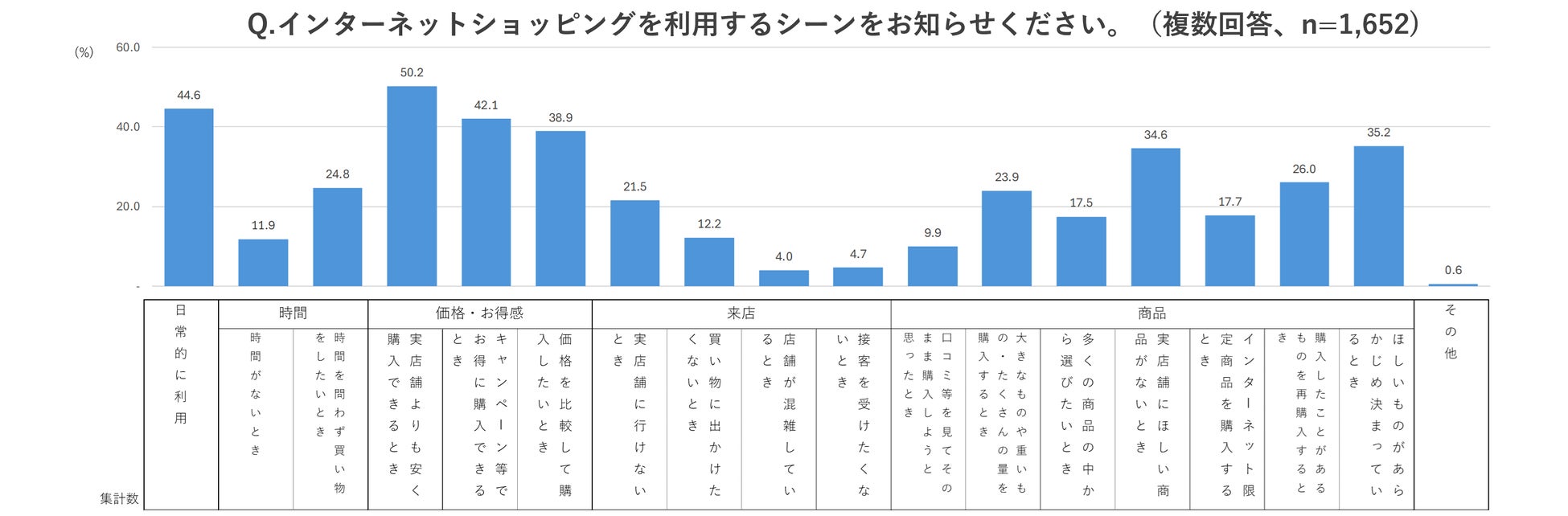 インターネットショッピングの利用シーンを尋ねたところ、「実店舗よりも安く購入できるとき」(50.2%)といったお得感が利用のタイミングとなることが多いことが分かりました。
