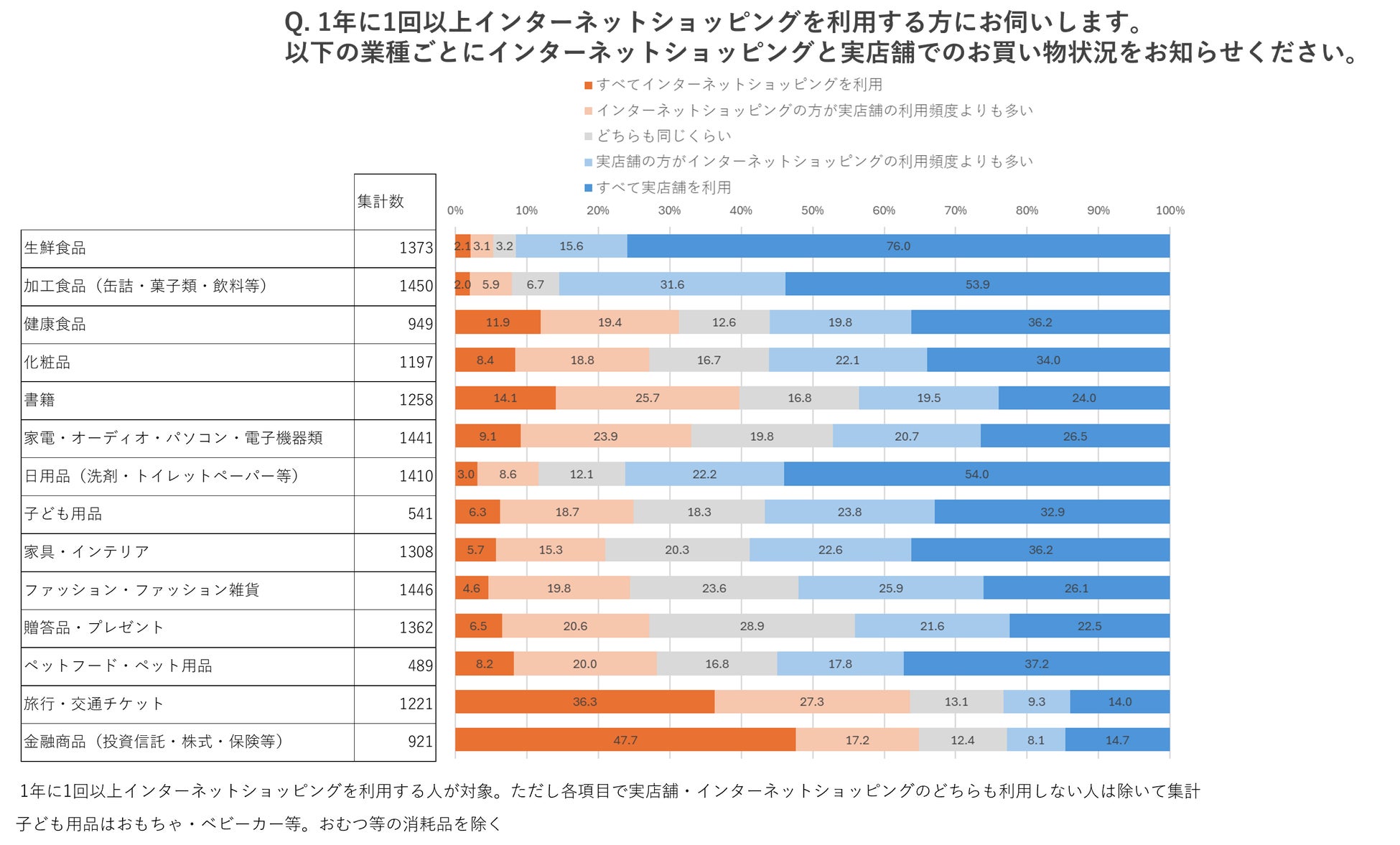 商品・サービス別にインターネットショッピングと実店舗の利用はどちらが多いか尋ねました。