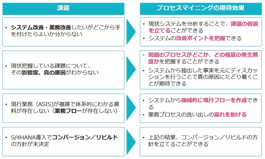 ※1 プロセスマイニングとは、SAP ERPなどのシステムのイベントログから現行業務プロセスを可視化し、課題や改善ポイントを分析する手法。