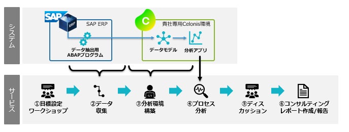 「プロセスマイニングサービス」は、データ抽出用ABAPプログラムを利用してSAP ERPから分析対象の業務プロセスデータを抽出し、Celonis環境に取り込みます。