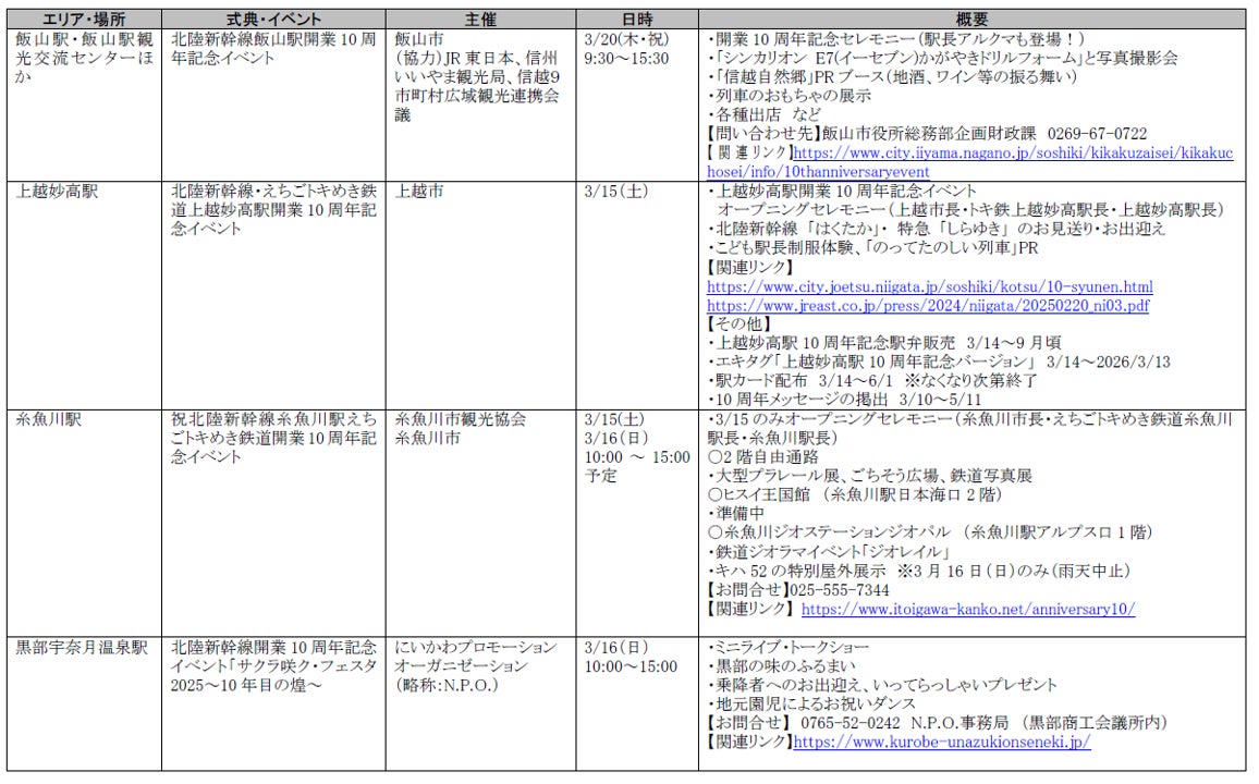 北陸新幹線開業10周年・1周年を記念し、新幹線駅周辺等で自治体の皆様と連携した様々なイベント等が開催されます。ぜひご参加ください。詳細は別紙1をご参照ください。