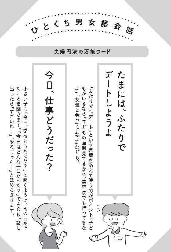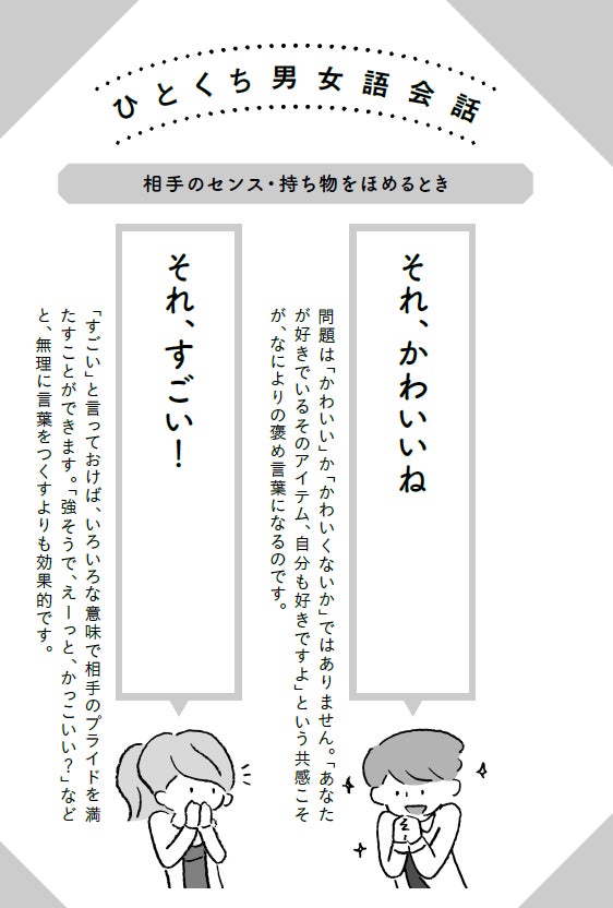そこで、本書ではすべての項目で「男は女に(⇔女は男に)こう言えば伝わる!」という象徴的なフレーズとして「ひとくち男女語会話」を紹介しています。