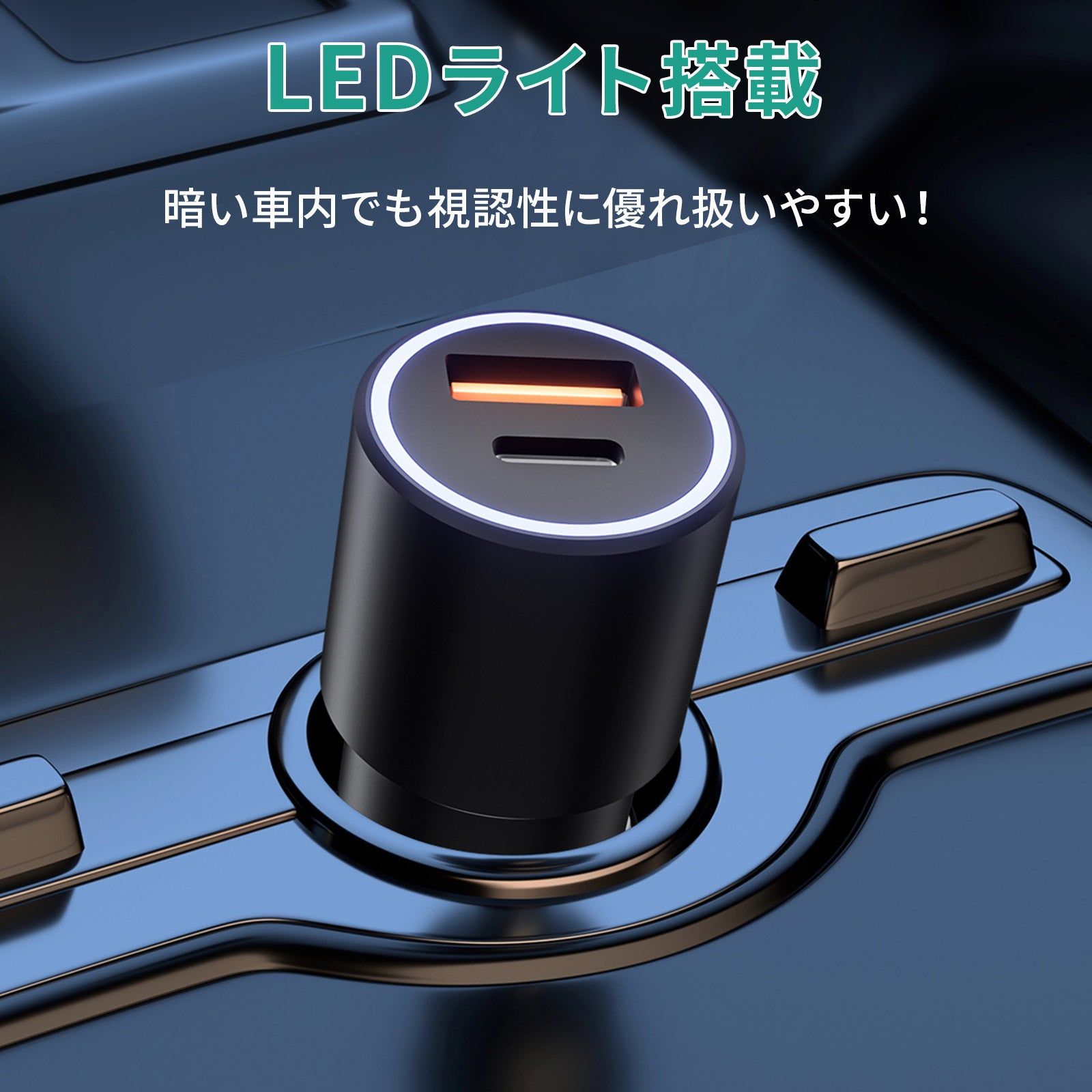使いやすい形状かつ省スペースなコンパクト設計で車内でも邪魔にならずに充電することができます。本体の素材にはキズがつきにくく軽くて丈夫なアルミ合金を採用。重さはわずか25gほどの超軽量。ブラックのカラーリングは車内のインテリアにもマッチします。