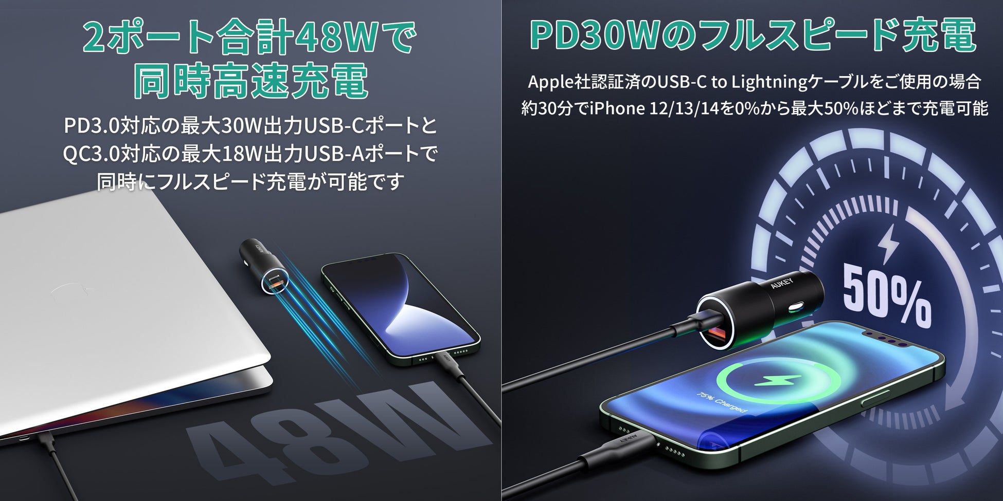 USB-AとUSB-Cの2ポートを搭載したシンプルデザインがおしゃれなカーチャージャー。PD3.0とQC3.0の2つの急速充電規格に対応し機能も充分です。2ポート合計で最大48W(30W + 18W)の高出力で2台の機器への同時充電が可能。お車でのお出かけにマストのアイテムになるでしょう。
