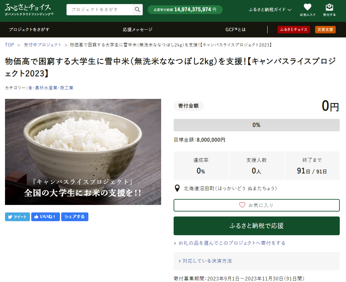 北海道沼田町とふるさとチョイス、ふるさと納税を活用して、物価高で困窮する全国大学生に食料支援をする「キャンパスライスプロジェクト」を開始