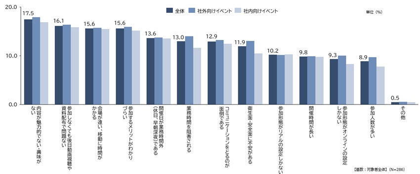 一方で、別設問において、参加にあたっては、オンラインであっても目的達成は可能という考え方への変化がみられました。特に社外向けイベントは全体的な不参加事由の選択率が高く、オフライン開催の場合はリアルタイムに同一の場・空間に参集することによるメリットを強く打ち出していく必要があります(図表7)。これまで以上に「内容の魅力度」が求められるとともに、「リアルタイム」に「同一の場・空間」に存在する意義が重要になってくるといえるでしょう。