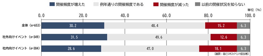 23年度のイベント開催頻度は7割以上のイベントがコロナ前と比較しても増えた、または同等となっており、特に社外向けのイベントに関しては増えていると答える割合が高くなっています(図表2)。