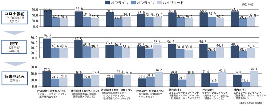 ●開催手法については、オフライン開催が増えており、コロナ禍以前を上回る。将来的にもオフライン開催の意向が継続するものの、イベント種別による開催手法の使い分け傾向が高まると想定される(図表1)。