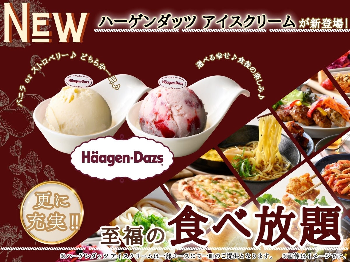 【選べる一皿♪食後の楽しみが増えました♪】充実の食べ放題が楽しめる『ニラックスブッフェ』一部コースにて「ハーゲンダッツ アイスクリーム」が登場!バニラ・ストロベリーのどちらか一皿をお選びいただけます!