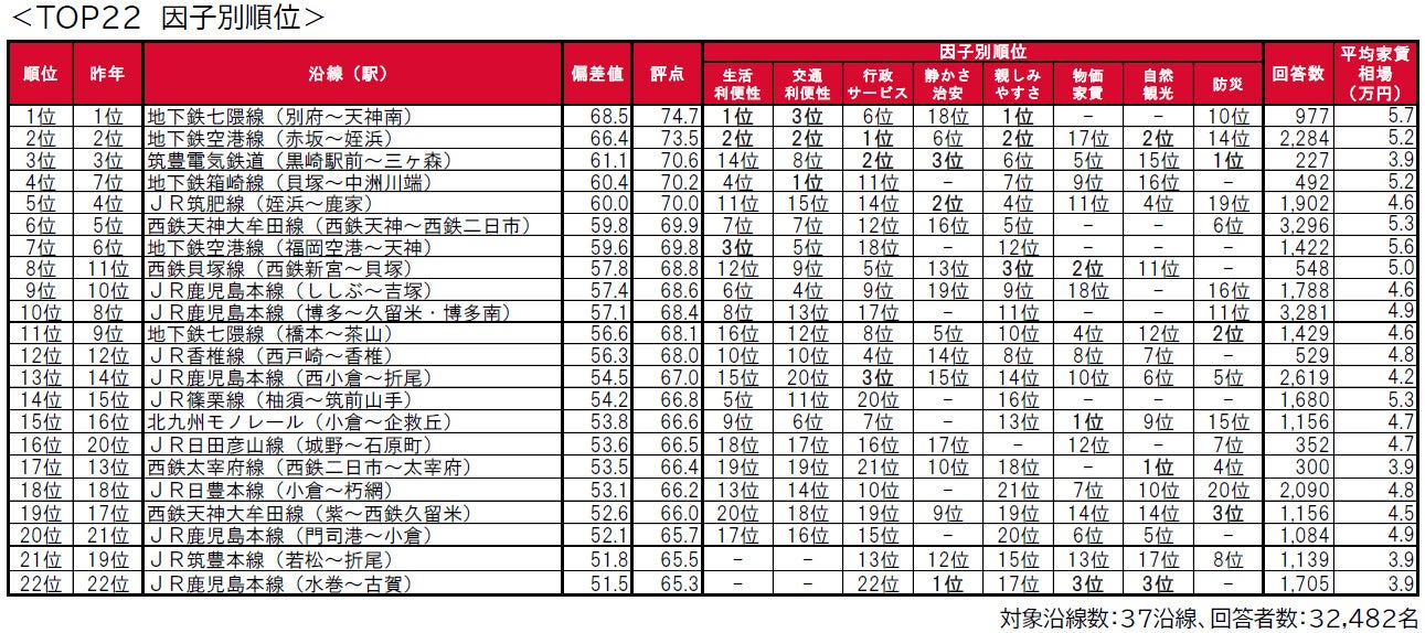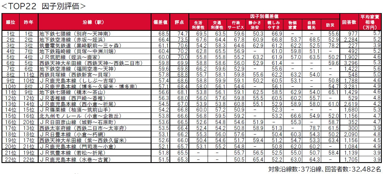 街の住みここち沿線ランキング2023<福岡県版> TOP22の因子別評価&順位