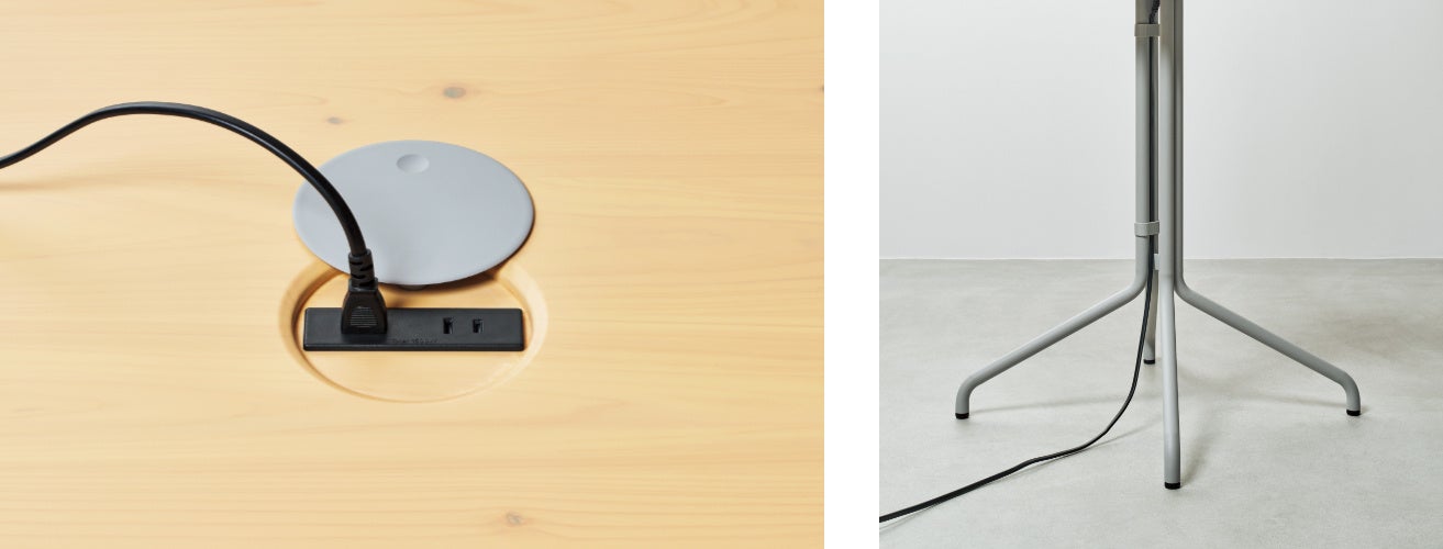 天板の自然な素材感を活かしながら、ITツールを用いたワークに必要な電源機能を搭載しています。使いやすい位置に配置した机上コンセント、スムーズな開閉が可能なコンセントカバー、脚に添わせて美しく配線するクリップなど、オフィスワークに必要な機能が無理なく溶け込むようにデザインしました。