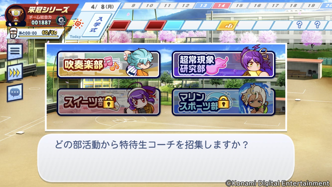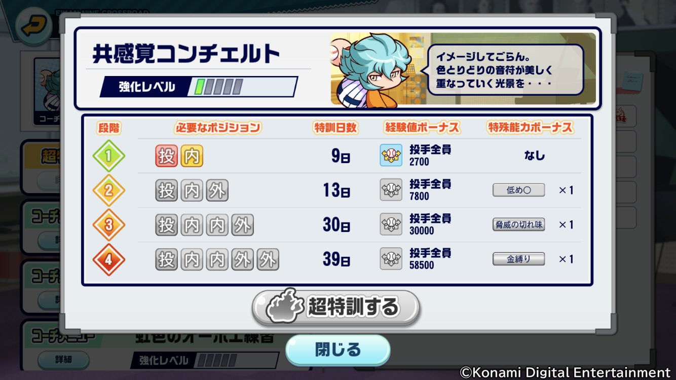 ③「特待生コーチ」を招集したら、練習参加選手から必要なポジションを集め、一定日数を進行させると「超特訓」が発生し経験値・特殊能力が獲得可能です。