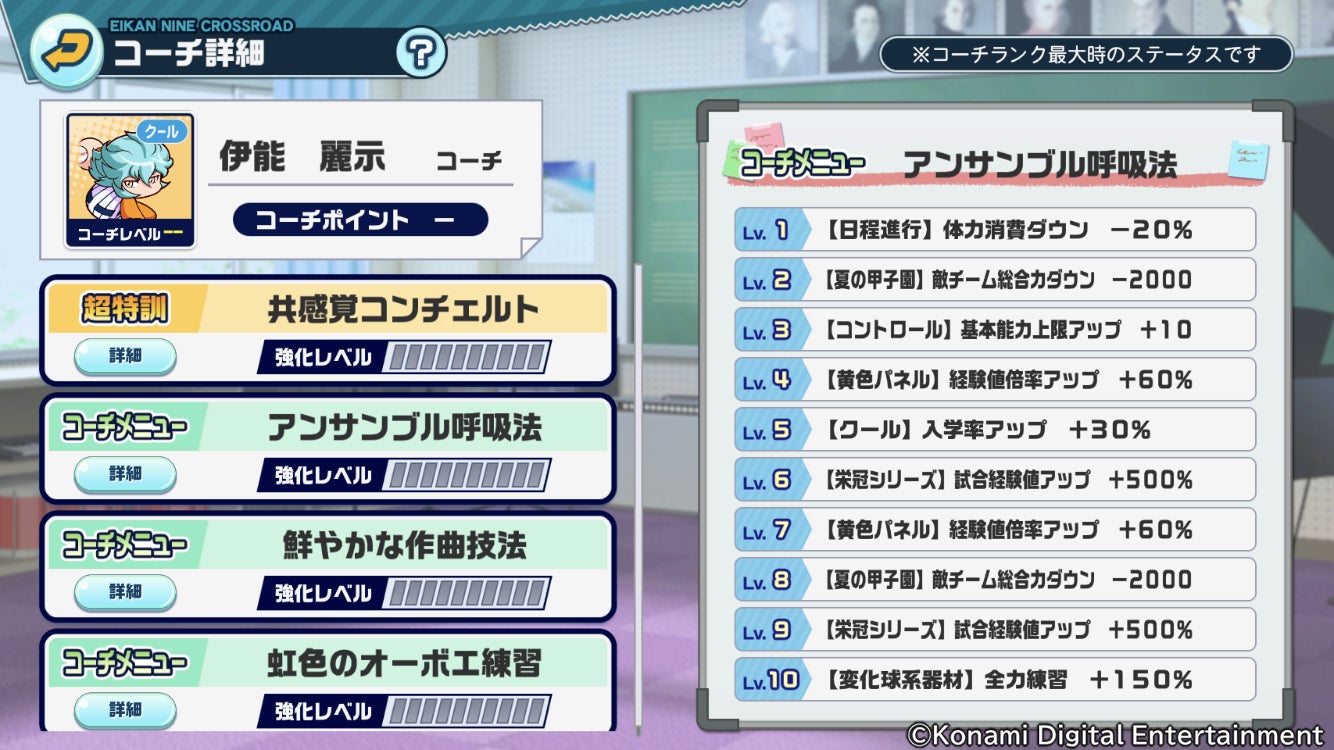 ④それぞれのコーチは、ボーナス効果「コーチメニュー」を持っています。組み合わせ次第で強力な効果を発揮するので、自分なりの組み合わせを見つけてみましょう。