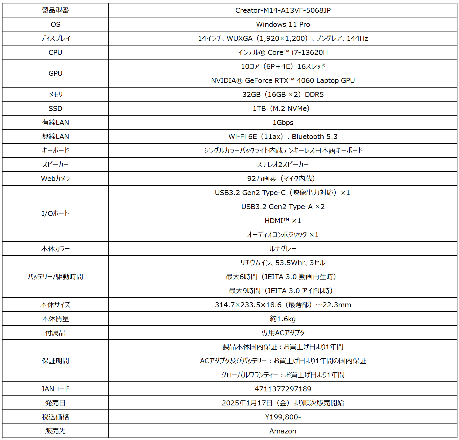 14インチのコンパクトな本体にi7とRTX 4060を搭載したパワフル構成 AmazonオリジナルクリエイターノートPC 「Creator-M14-A13VF-5068JP」発売