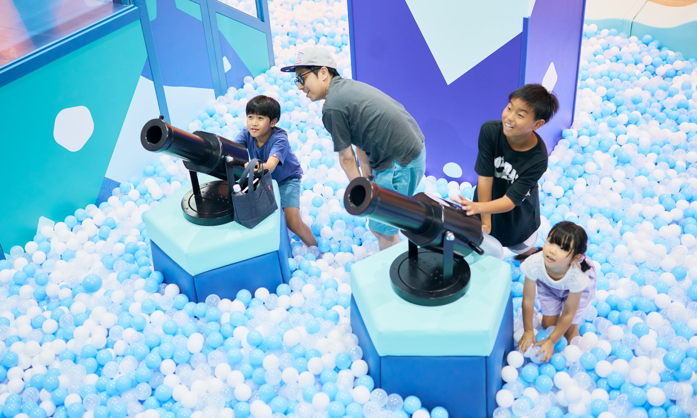 氷山をイメージした氷山スライダーを滑ったらそのまま広いボールプールの海にダイブ!バズーカ風空気砲で的当てゲームも楽しめます。