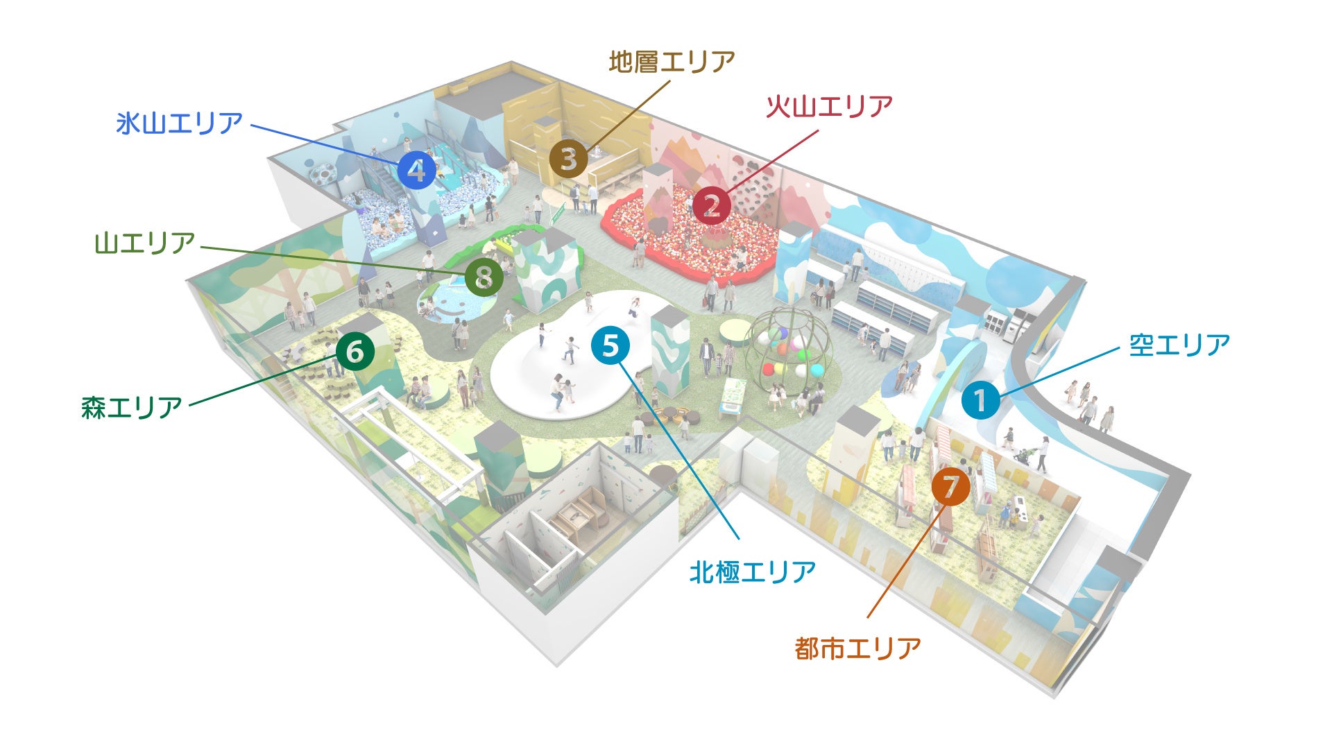 「ちきゅうのにわ」は、0歳の赤ちゃんから12 歳を対象に、子どもとファミリーが夢中であそびながら地球の面白さや自然の大切さが学べるプレイグラウンドです。2023 年3月に1号店「ちきゅうのにわ 東京ソラマチ店」をオープンし、今回が15店舗目となります。「氷山」「火山」「地層」など自然をモチーフにした各エリアには、氷山をイメージした滑り台やボールが飛び出す火山、砂に触れる感覚を楽しめる砂場、定期的に開催するSDGs や自然の大切さを学べるワークショップなど、屋内にありながら自然とふれあうように子どもたちの「こころ・からだ・あたま」の成長を促す、楽しいあそびがたくさん詰まっています。