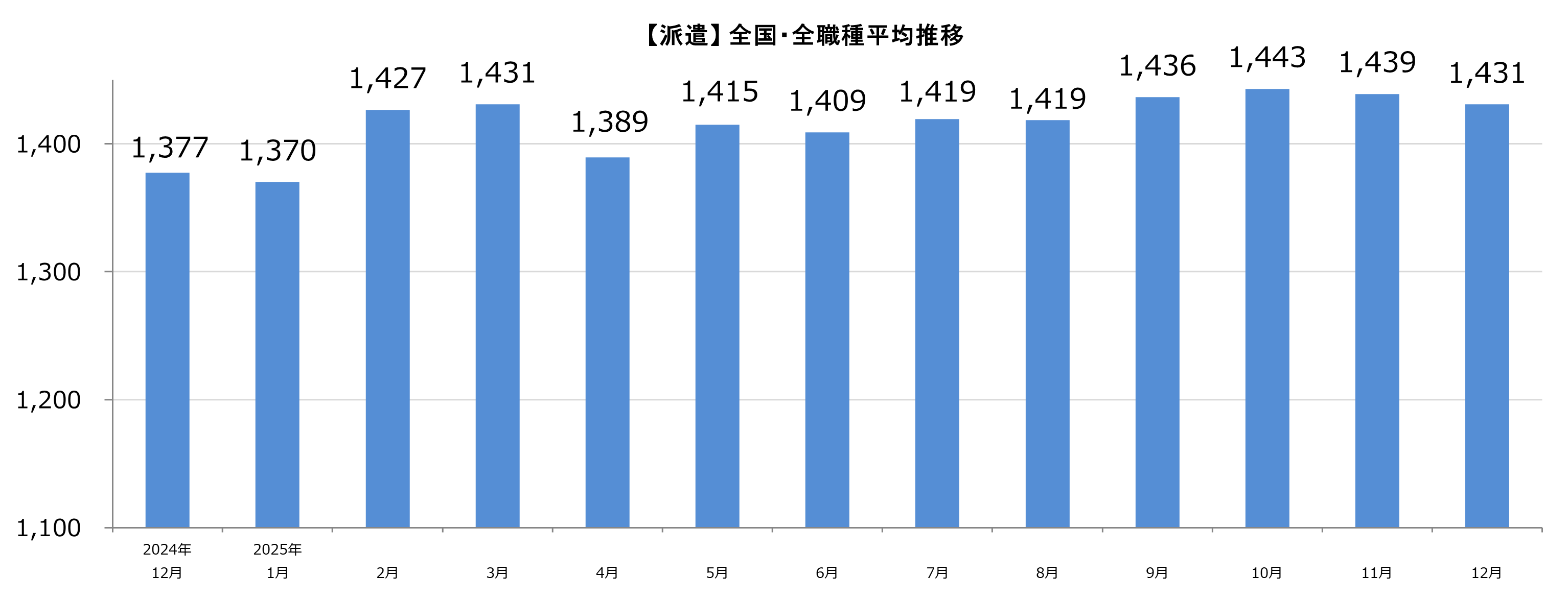 【派遣】全国・全職種平均時給は1,431円。前月比-8円。前年同月比+54円。
