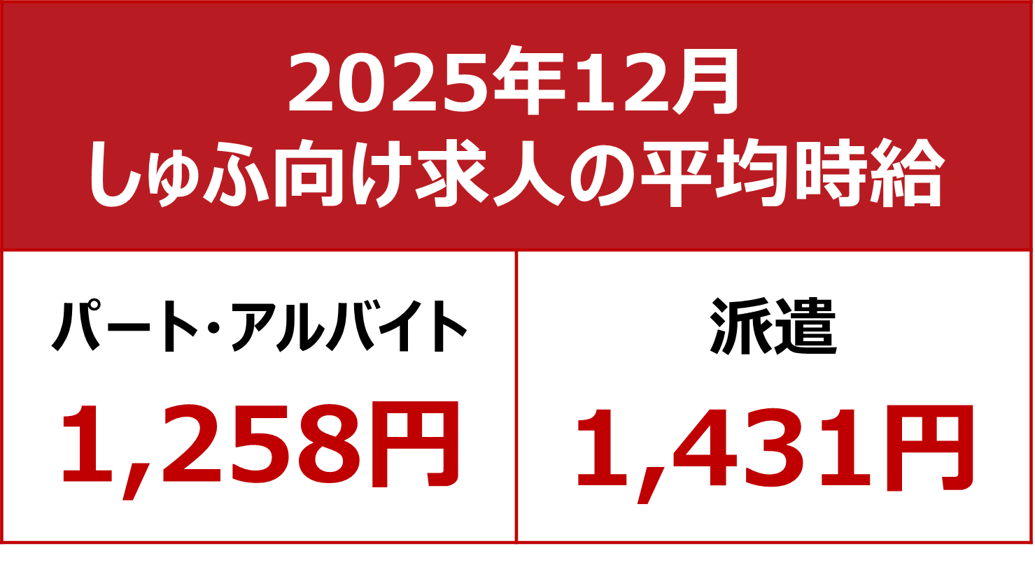 【2025年12月しゅふ求人の平均時給】パート・アルバイト:『1,258円』、派遣:『1,431円』/「フード・飲食」時給4ヶ月連続過去最高を更新!