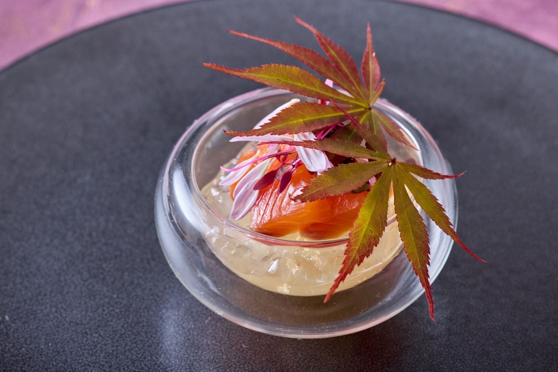 渥美サーモンの軽い燻製 豊橋冬瓜の煮びたしと白出汁のジュレ キャビアを添えて