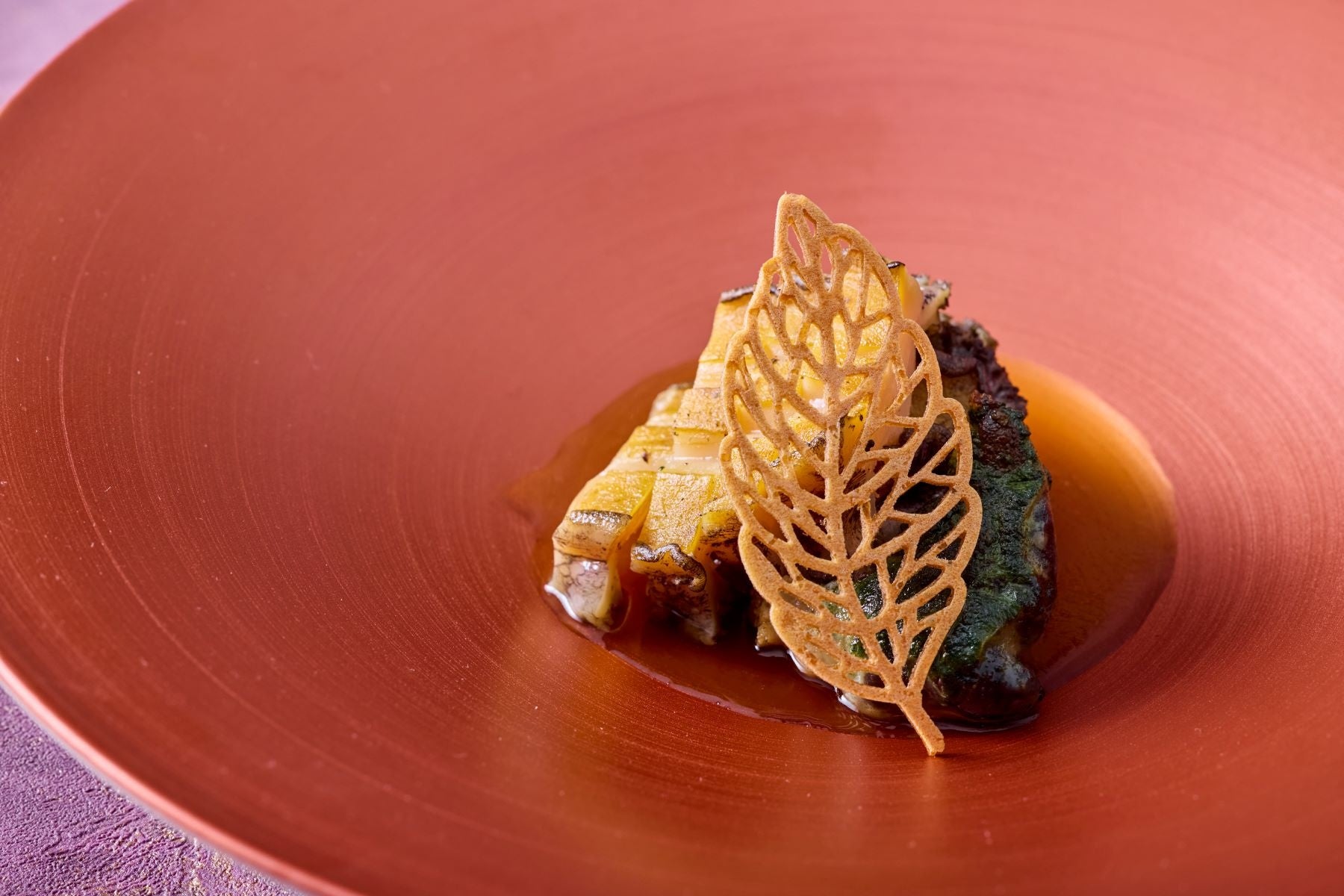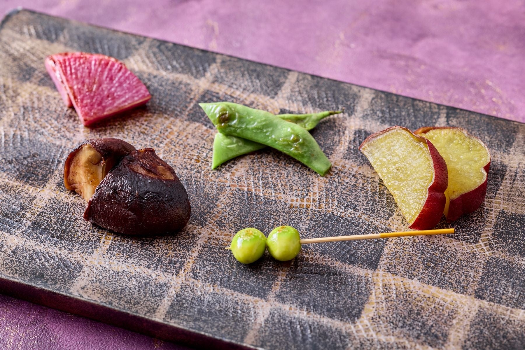 フランベしたフルーツトマトをピスタチオのガレットで包み、スライスした最高級生ハムを添えて完成するおもてなしの1品から始まる本コースは、地元渥美サーモンの燻製に豊橋の冬瓜やキャビアを乗せた前菜、旨味のある宮崎県の佐土原茄子を添えた蝦夷鮑のグリル、フィレとサーロインを食べ比べできる黒毛和牛で構成。