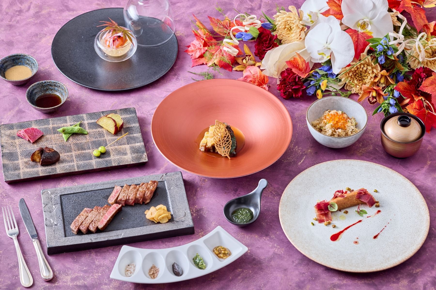 “味覚の秋”にふさわしいメニューラインナップを取り揃え、中でもおすすめは、“蝦夷鮑と黒毛和牛”の食べ比べが楽しめるディナーコース(平日22,000円 消費税込・サービス料15%別)。