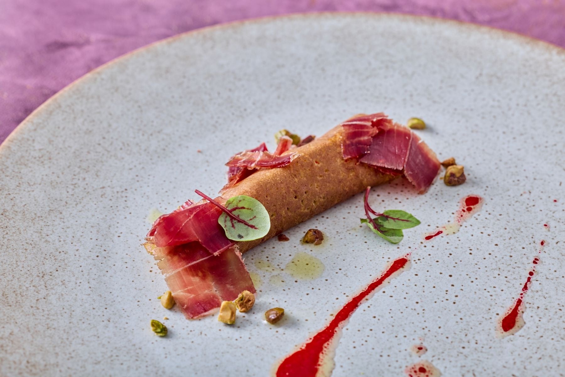フルーツトマトのフランベ イベリコ・ベジョータの生ハム ピスタチオのガレットに包んで