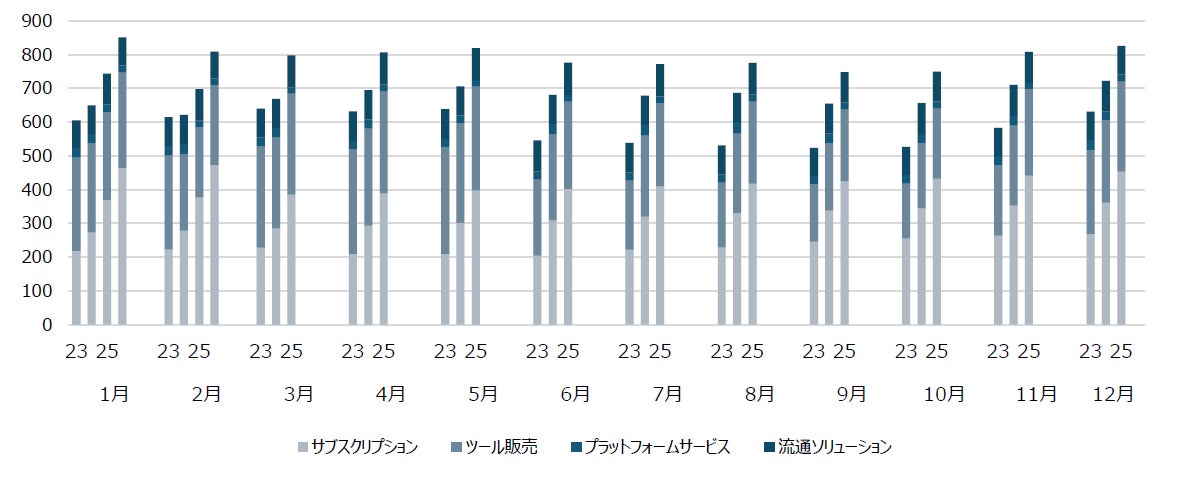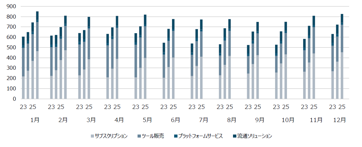 サブスクリプションは、CLIP STUDIO PAINT サブスクリプションモデルの売上です。ツール販売には、買い切りモデルや法人向けライセンスの売上などが含まれます。プラットフォームサービスには、CLIP STUDIO WEBサービスでの売上等が含まれます。流通ソリューションには、電子書籍及びDC3に関連する売上が含まれます。
