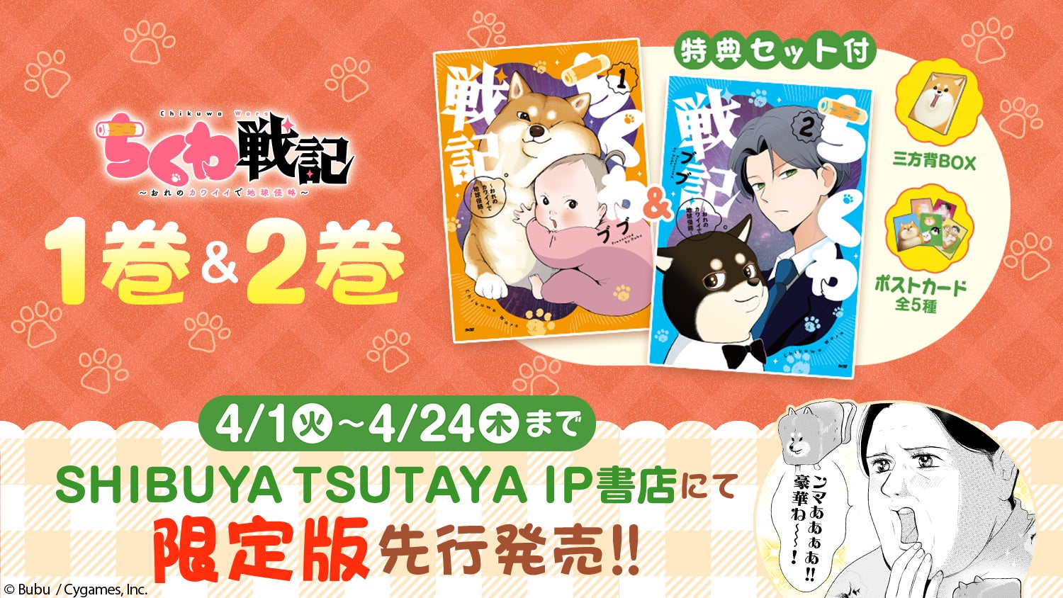 株式会社Cygames(本社:東京都渋谷区、代表取締役社長:渡邊耕一)は、マンガ配信サービス「サイコミ」で連載中の漫画『ちくわ戦記~おれのカワイイで地球侵略~』の紙コミックス1巻と2巻を同梱した限定版をSHIBUYA TSUTAYA 6階IP書店にて2025年4月1日(火)から4月24日(木)まで先行発売します。また開催期間中は店頭にて初の紙コミックス化を記念した装飾を施したフェアを実施します。