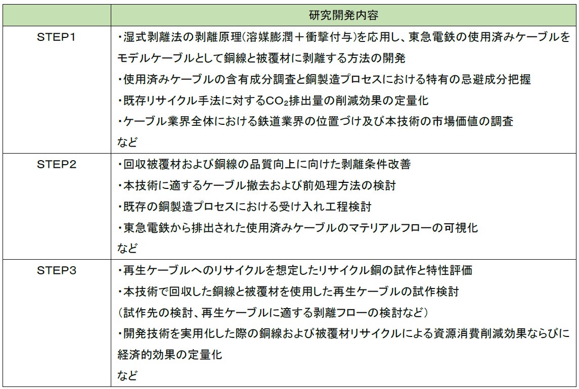 現状廃棄されている東急電鉄の電気設備のケーブルや線路脇の信号ケーブルをモデルケーブルとして、東北大学が主導して三菱マテリアルと共に開発してきた湿式剥離法の剥離原理(溶媒膨潤+衝撃付与)を応用し、銅線と被覆材に剥離する技術の確立と、本技術により回収した銅線と被覆材を使用して、東急電鉄をはじめとする、鉄道業界で使用する再生ケーブルとしてリサイクルすることを目指します。