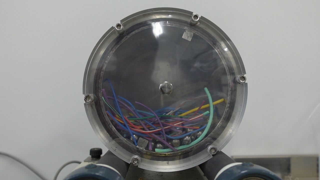 ※ 湿式剥離法の剥離原理(溶媒膨潤+衝撃付与):有機溶媒にケーブルを浸漬すると被覆材が膨張(膨潤)します。その状態で金属などの小さなボールで衝撃を与えることで、銅線および被覆材を損傷させることなく、分離・剥離させることを「湿式剥離法」と呼んでいます。