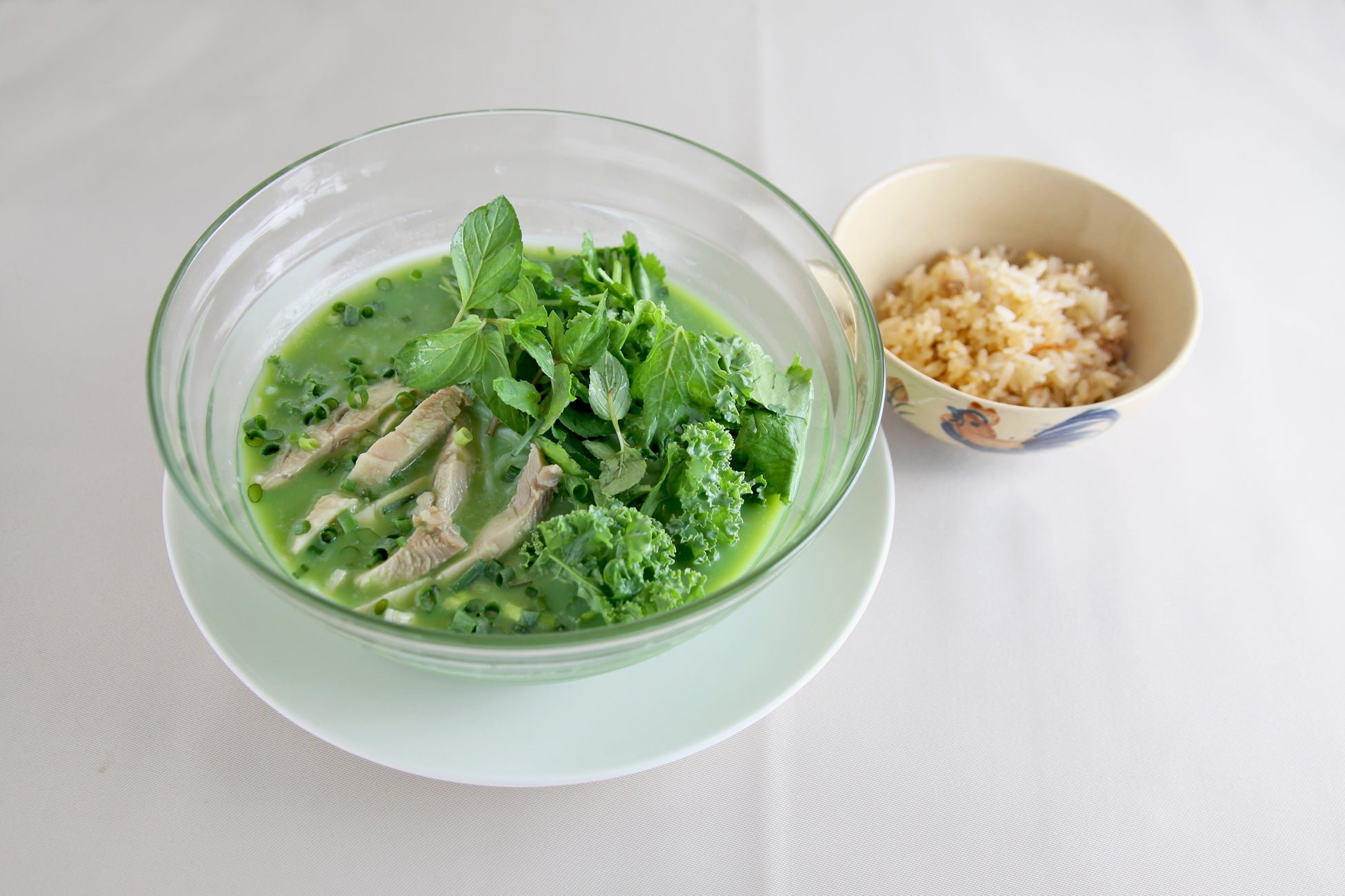 トッピングは蒸し鶏とハーブでさっぱりといただけます。