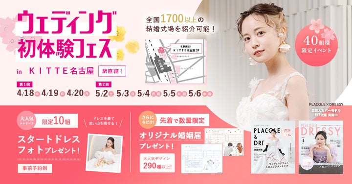 「PLACOLE & DRESSY」ブランドを展開する、冒険社プラコレ(本社:神奈川県鎌倉市、代表取締役CEO:武藤功樹)は、名古屋駅直結商業施設KITTE名古屋3F、ウェディングのテーマパークカフェ"DRESSY CAFE"にて、4/18(土)~4/20(月)の3日間限定で、これから結婚式をお考えのカップル様に向けた、個室相談やウェディングドレス試着ができる豪華特典付きのウェディング初体験フェスを開催いたします。(40組様限定、無料開催)