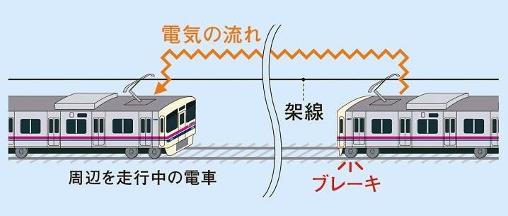 回生ブレーキとは、電車がブレーキをかけた際にモーターを発電機として作動させ、発生した電力を架線に戻すことで他の電車が使えるようにする装置です。当社では 1999年に京王線・井の頭線全車両への装備を完了しました。
