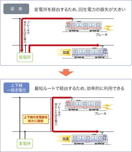 上り線と下り線のき電線(電車に電気を供給する線)を接続することで、回生ブレーキで発生した電気を他の電車に最短ルートで送り、電気を送る際の損失低減を図ることができる設備です。当社では、2012年に井の頭線で、2021年に高尾線、2023年に相模原線で整備しました。