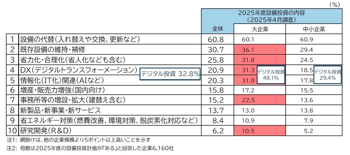 「設備の代替」が60.8%で突出 大企業の半数近くが「デジタル投資」を計画