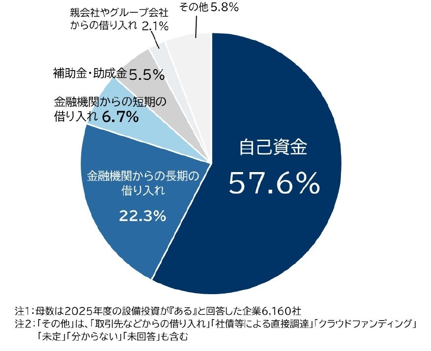 2025年度に設備投資の予定(計画)が『ある』企業に対して、主な資金調達方法を尋ねたところ、「自己資金」が57.6%で最も高かった。他方、金融機関からの「長期の借り入れ」(22.3%)や「短期の借り入れ」(6.7%)といった、金融機関からの調達は29.0%と3割を切る結果となった。