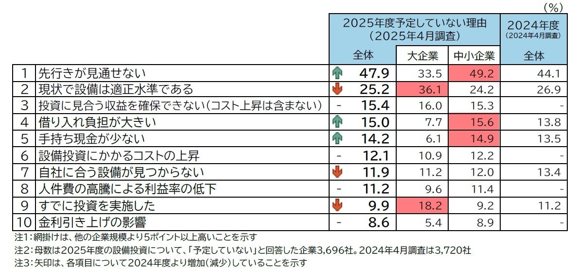2025年度に設備投資を「予定していない」企業に対して、設備投資を行わない理由を尋ねたところ、「先行きが見通せない」が47.9%で最も高く、前年からの上昇幅(+3.8ポイント)が最も大きい項目となった(複数回答、以下同)。
