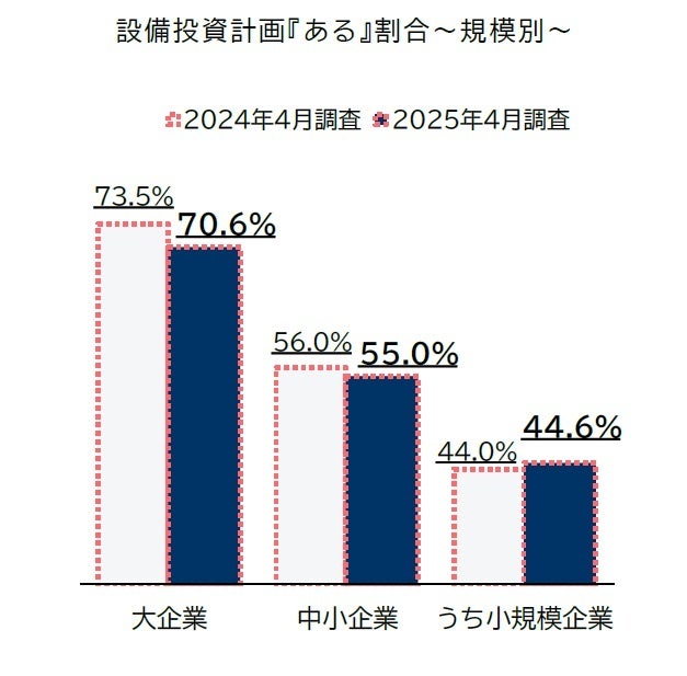 設備投資の予定(計画)が『ある』企業の割合を規模別にみると、「大企業」は70.6%と7割台を維持した一方で、「中小企業」は55.0%、うち「小規模企業」は44.6%となっており、規模が小さくなるほどその割合が小さい傾向が続いている。