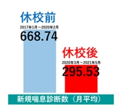 - 子どもの喘息新規診断数は、2020年3月の全国一斉休校後に著しく減少し、その後も15カ月に渡って低水準を示しました。