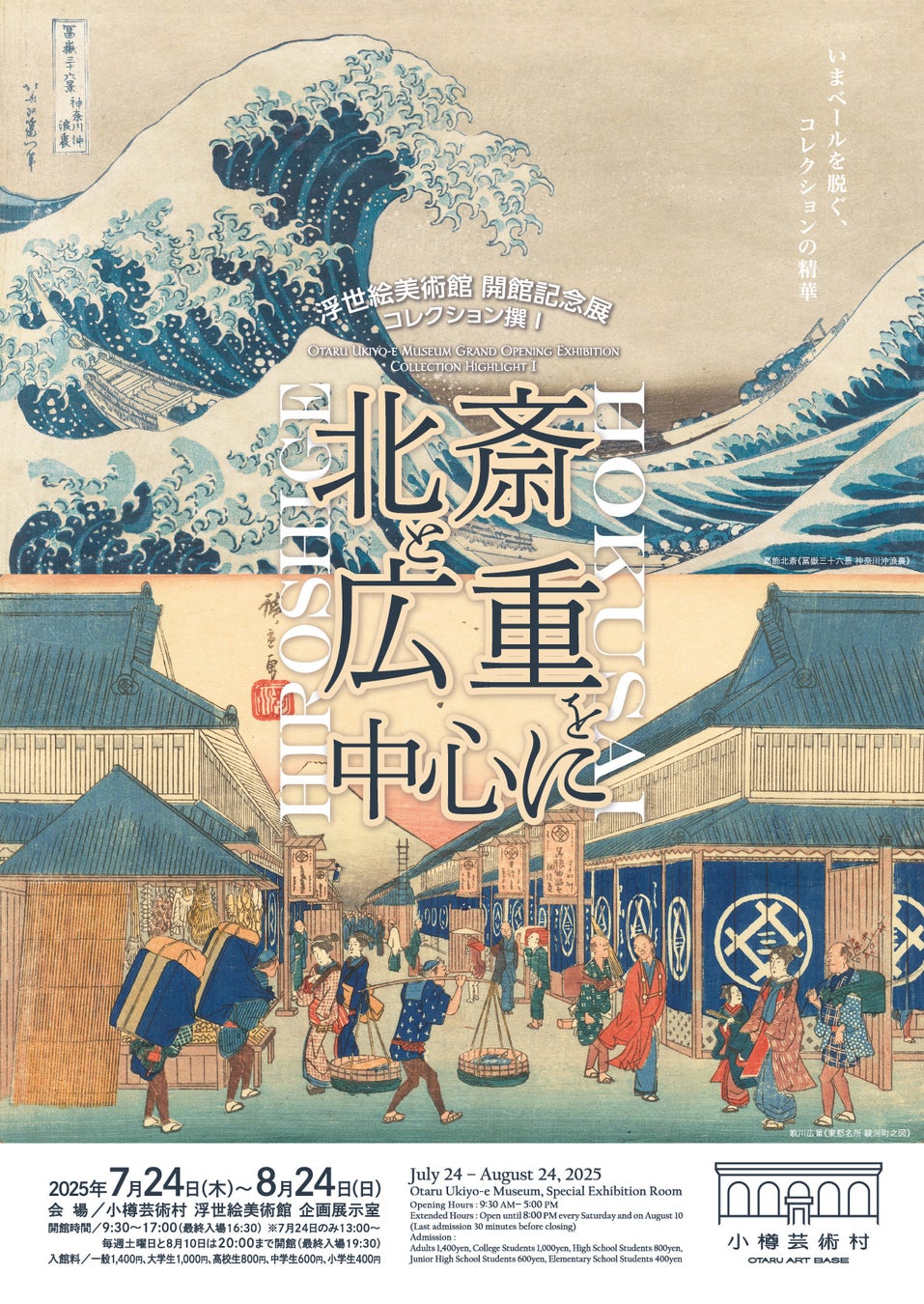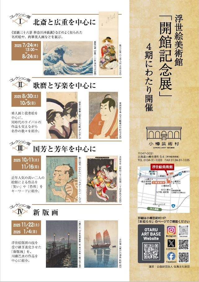 開館当日は、13:00より一般公開を予定しています。15:00からは、旧三井銀行小樽支店を会場として、開館記念講演会も開催予定です。開館記念展は、2025年7月24日(木)から2026年1月4日(日)にかけて4期にわたって開催し、小樽芸術村の代表作を4つのテーマに分けてご紹介します。第1期は、「北斎と広重を中心に」をテーマに、江戸後期に活躍した浮世絵師、葛飾北斎と歌川広重の作品を中心にご紹介します。