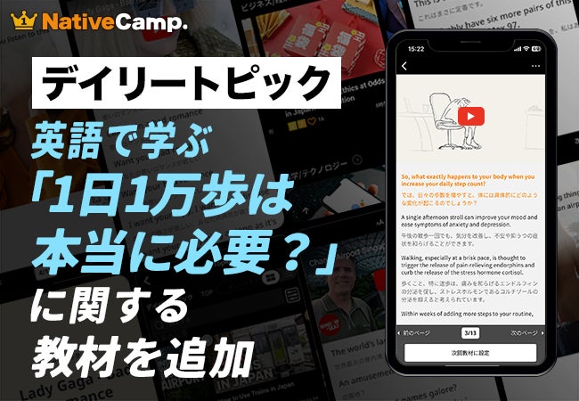 ネイティブスピーカーと回数無制限のオンライン英会話サービス「ネイティブキャンプ英会話」を展開する株式会社ネイティブキャンプ(東京都渋谷区 代表取締役:谷川国洋)は、人気教材「デイリートピック」に、健康とウォーキングをテーマにした新教材 “Do you really need to take 10,000 steps a day?” を追加しました。本教材では、日々の歩数を増やすことで体に起こる変化について英語で学び、講師とディスカッションすることができます。