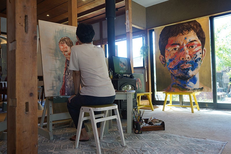 築60年の民家を改修したコミュニティスペースCo-coyaに、9月と11月の2回に分けて滞在しました。滞在中、人類の顔面に抽象絵画が取り憑いた『Abstract Face』シリーズをオープンな空間で展示し、作品のコンセプトやストーリーを伝えながら、来場者と密な関係性を築き、9月の滞在時に出会った地元住民をモデルにして制作した作品を11月に展示しました。