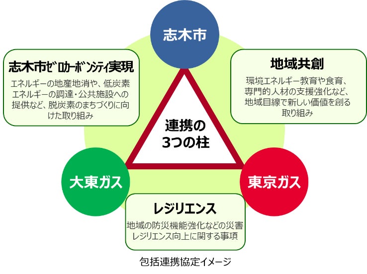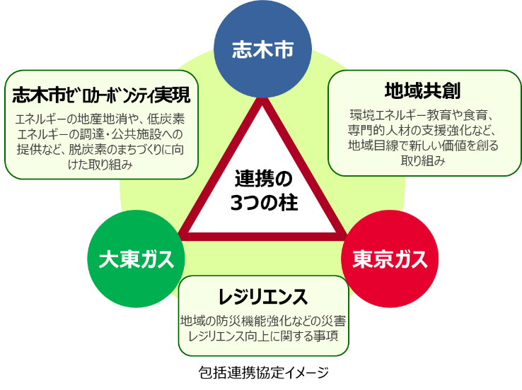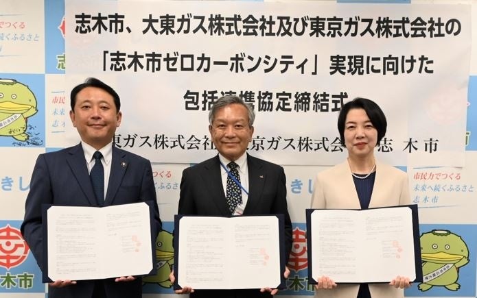 近年、世界的規模で地球温暖化による問題が深刻化しており、気候変動対策や自然環境の保全など、地方自治体における取り組みが求められる中、埼玉県を中心に事業展開し、環境にやさしいクリーンなエネルギーを安全に安定して供給している大東ガス、EV導入支援や防災システム構築支援など全国の脱炭素に関する知見を所有されている東京ガス、及び志木市の連携は、本市のゼロカーボンシティ実現に向けた、大きな一歩になると期待しています。