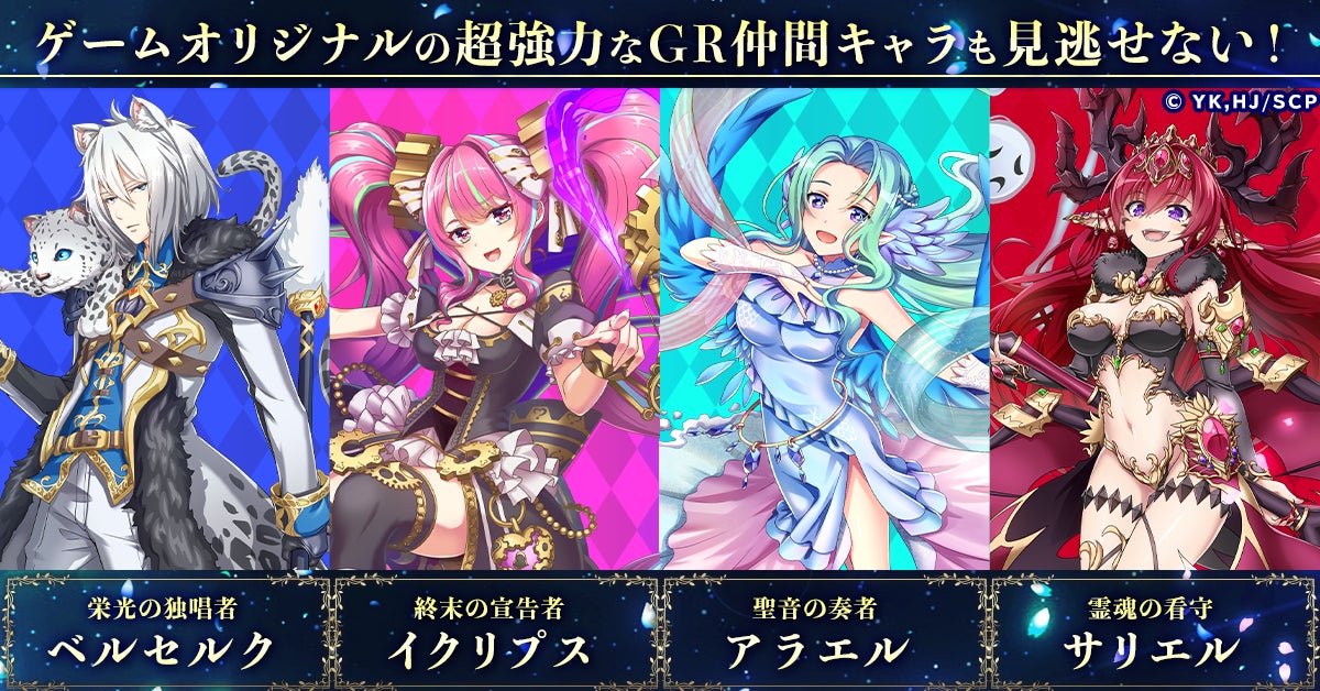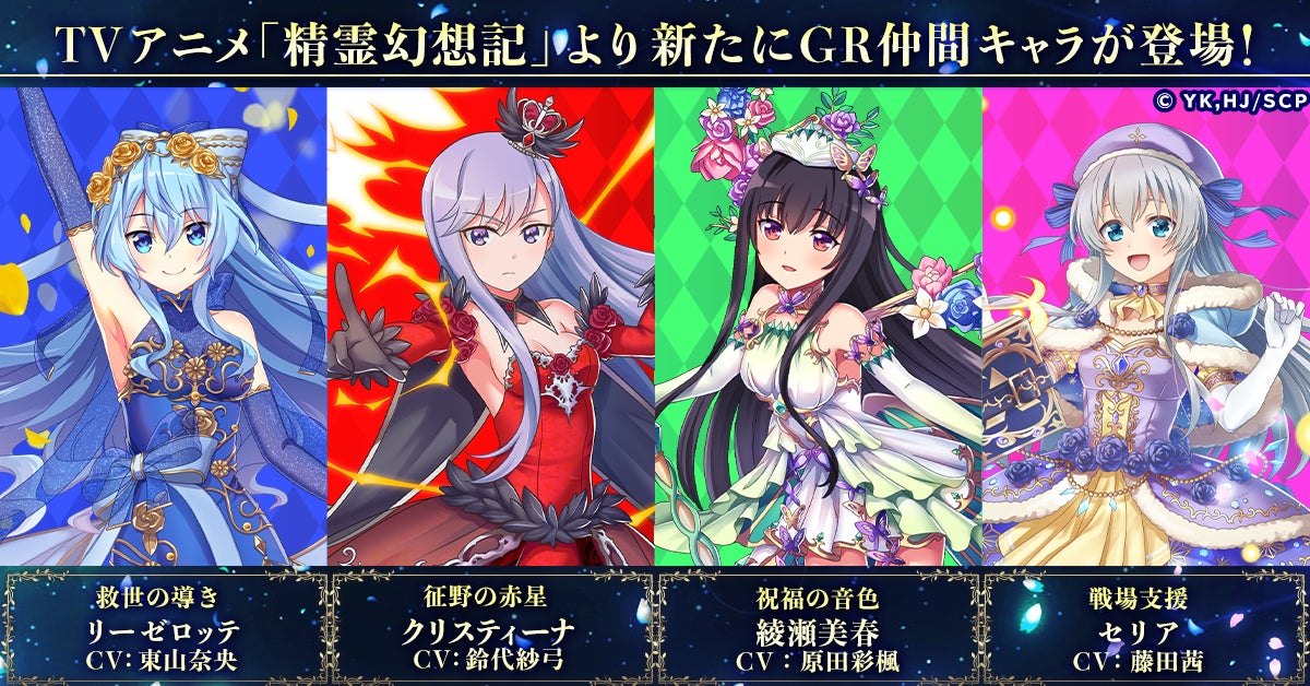 TVアニメ「精霊幻想記」より、「クリスティーナ=ベルトラム(CV: 鈴代紗弓)」、「綾瀬美春(CV:原田彩楓)」が、新たなGR仲間キャラとして登場します。また、ゲームオリジナルキャラクターとして、「イクリプス」「アラエル」がGR仲間キャラとして、「サキュバス」がLR支援キャラとして登場します。