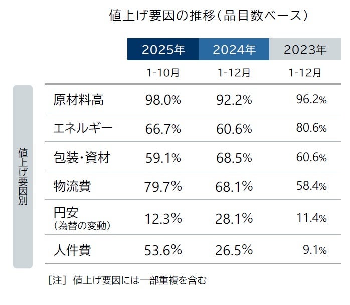 値上げ要因では、原材料の価格高騰に加え、光熱費の上昇による生産コストの上昇、人手不足による労務費の上昇、物流費の上昇などが複合的に重なった。原材料などモノ由来(「原材料高」)の値上げが全体の98.0%を占め、前月調査時(97.9%)から拡大した。人手不足に伴う昇給・賃上げによるコスト増を背景とした「人件費」(53.6%)は、要因別の集計を開始した2023年以降で最高だった。また、特に6月以降の値上げを中心に電気・ガスなど「エネルギーコスト(光熱費)」由来の値上げで上昇が続き、年間で66.7%を占めた。