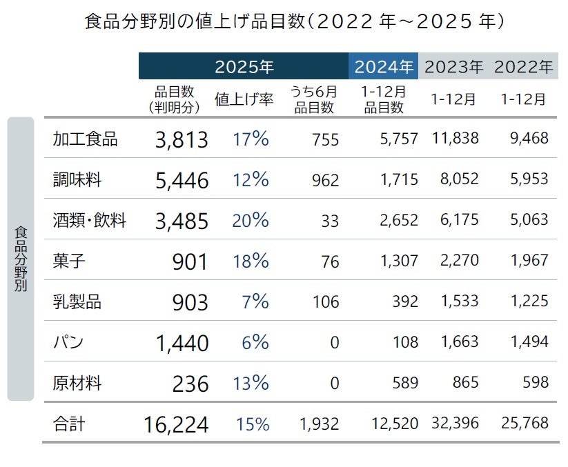 2025年通年の累計品目数は1万6224品目となり、年間で2万品目を超える可能性が高まった。飲食料品の値上げの勢いは、前年に比べて強い状態が続いている。