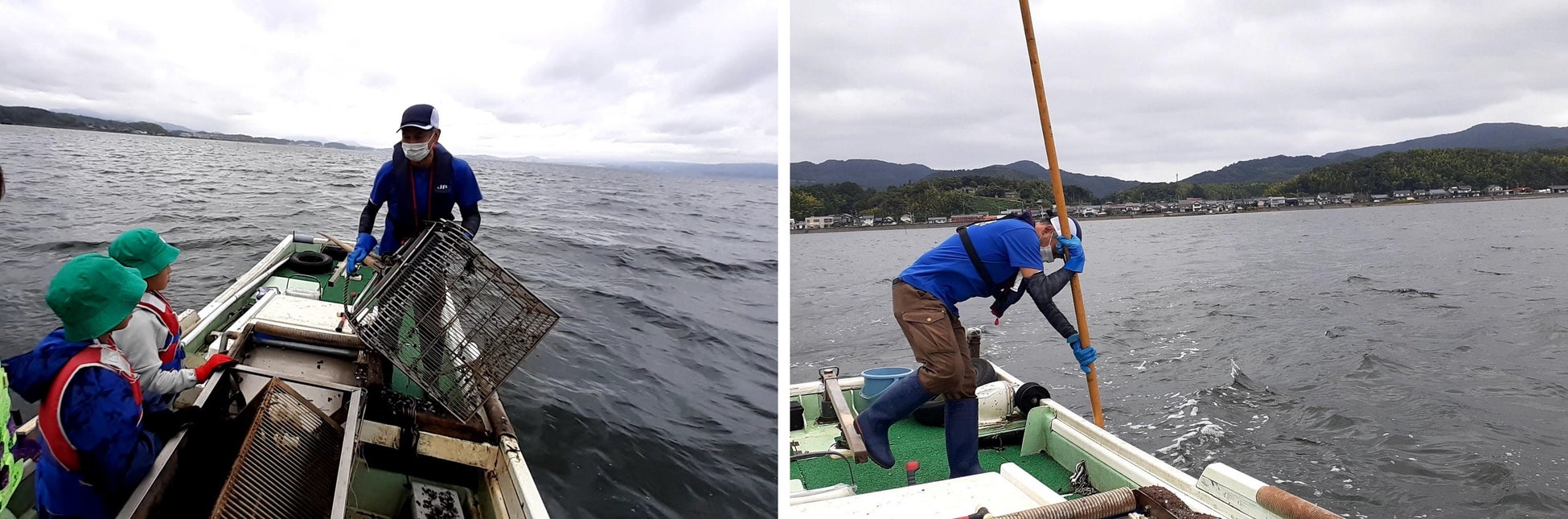 ヤマトシジミの漁獲量日本一として知られる宍道湖。その地形は時代によって変化し、昭和の淡水化事業により、シジミ絶滅の危機に瀕した時期もありました。まずは、宍道湖の地形の移り変わりや汽水とは何かを学び、海に依存する汽水でしか生きられないヤマトシジミについて説明を受けました。その後、調査隊は、漁船に乗り込み宍道湖へ出航!シジミ漁密着体験です。シジミは、ジョレンと呼ばれる漁具を使って獲ります。漁師さんが全身を使ってジョレンを操り、シジミを獲る様子を見学しました。