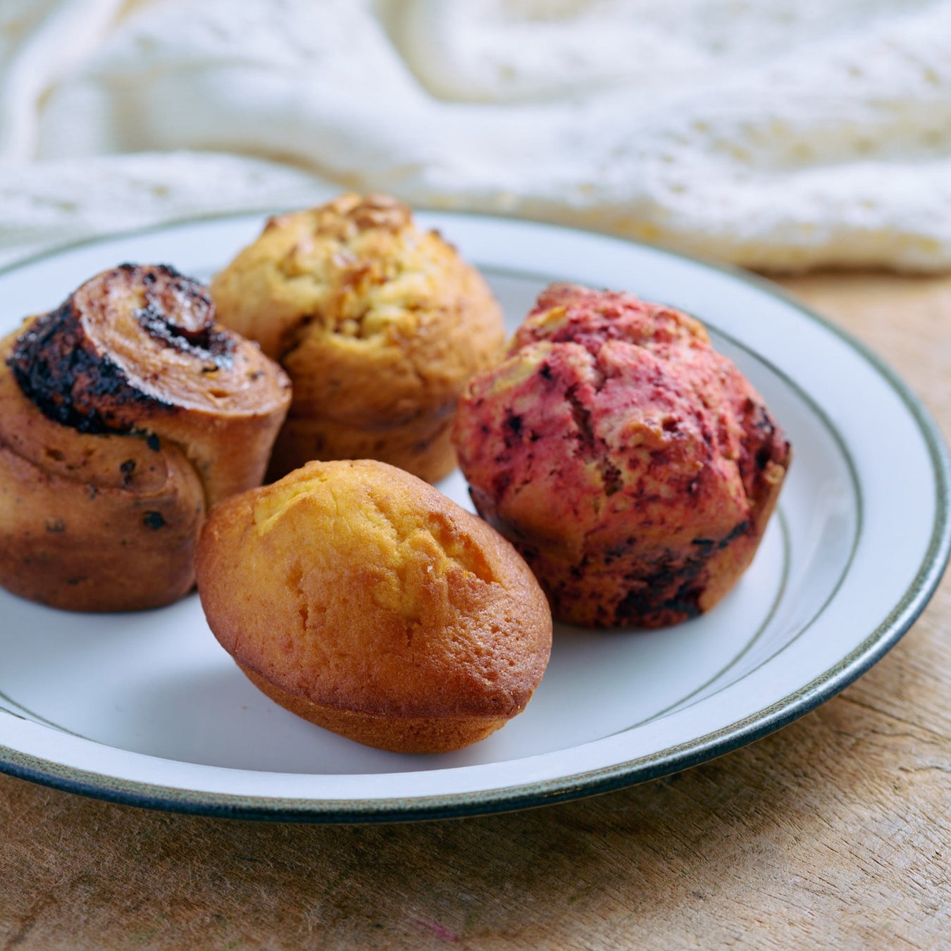 左:カカオハスクロール 1個550円 上:季節の野菜のマフィン右:季節の果物のマフィン、下:レモンケーキ各600円