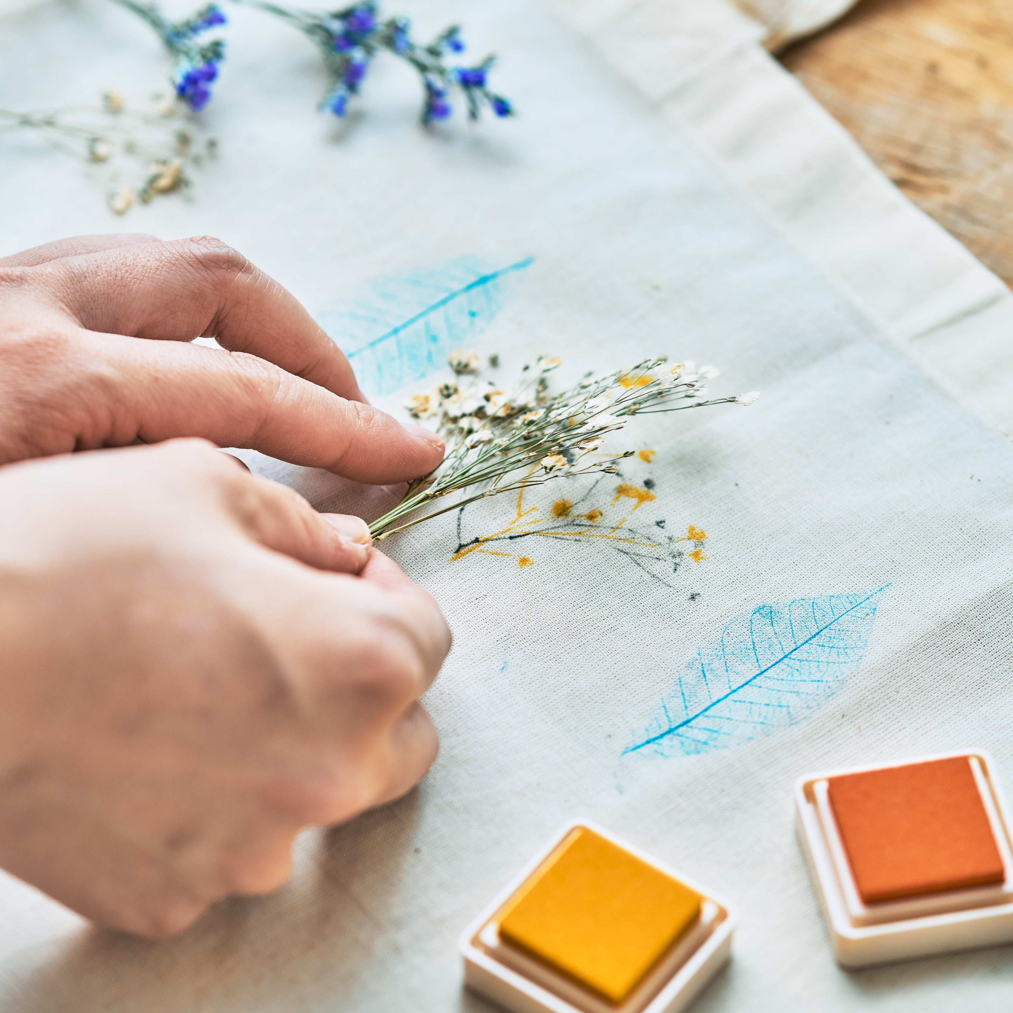 「ロスフラワー®」や葉っぱをスタンプしてオシャレなエコバッグを彩ります。花びらや葉っぱの繊細な表情を感じながら、自分だけのデザインを形にする楽しさを体験しませんか。